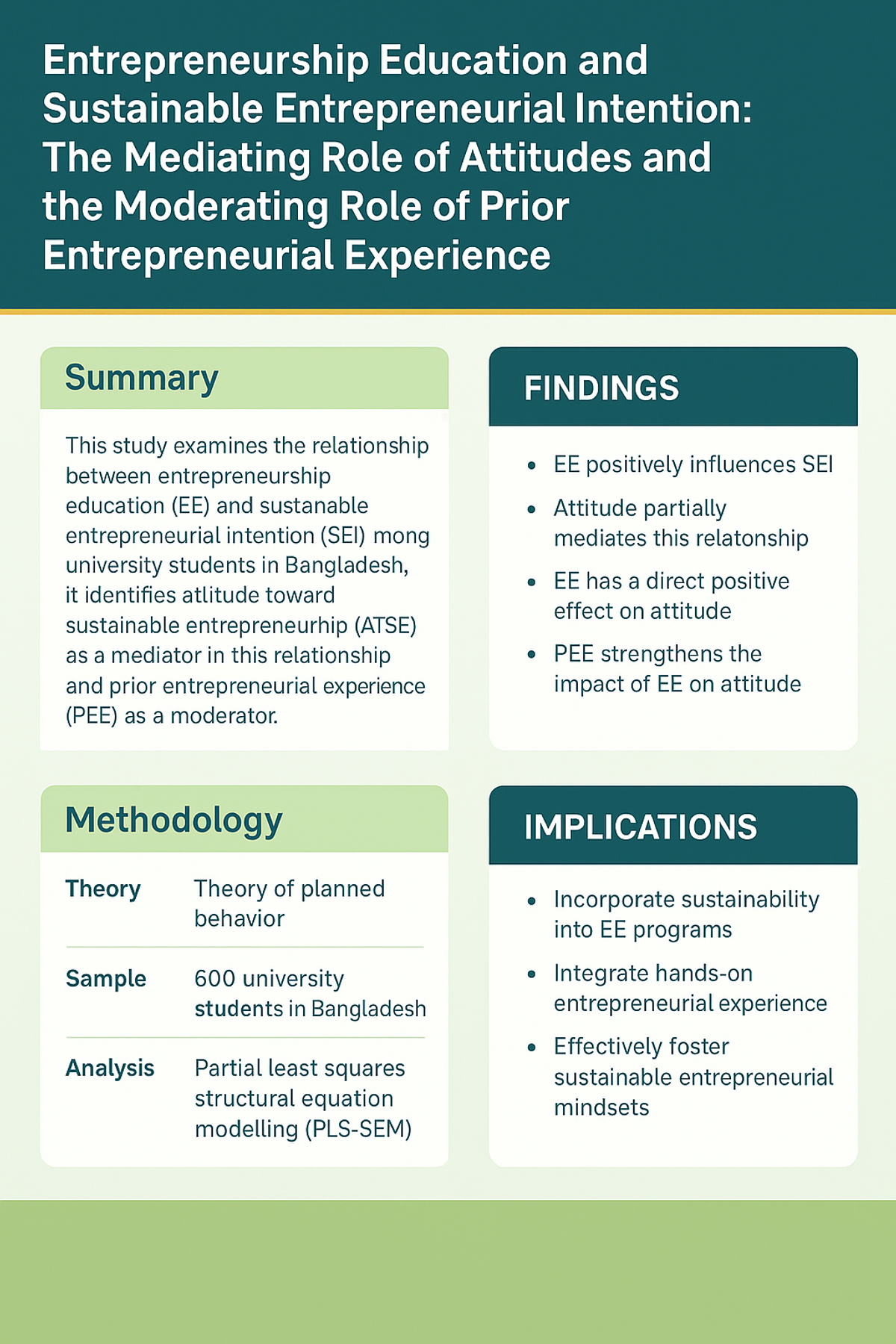 This study investigates how Entrepreneurship Education (EE) influences Sustainable Entrepreneurial Intention (SEI) among Bangladeshi university students, focusing on the mediating role of Attitude toward Sustainable Entrepreneurship (ATSE) and the moderating role of Prior Entrepreneurial Experience (PEE). Using a quantitative approach grounded in the Theory of Planned Behavior and Human Capital Theory, data from 600 students were analyzed using PLS-SEM via SmartPLS4. The findings reveal that EE significantly enhances SEI both directly and indirectly. ATSE partially mediates this relationship, indicating that EE strengthens positive attitudes toward sustainable entrepreneurship, which in turn increases SEI. Furthermore, PEE moderates the relationship between EE and ATSE, showing that students with prior entrepreneurial experience develop stronger sustainability-oriented attitudes. Overall, the study emphasizes the importance of integrating sustainability and experiential learning into entrepreneurship education to cultivate sustainable entrepreneurial mindsets among university students in Bangladesh.